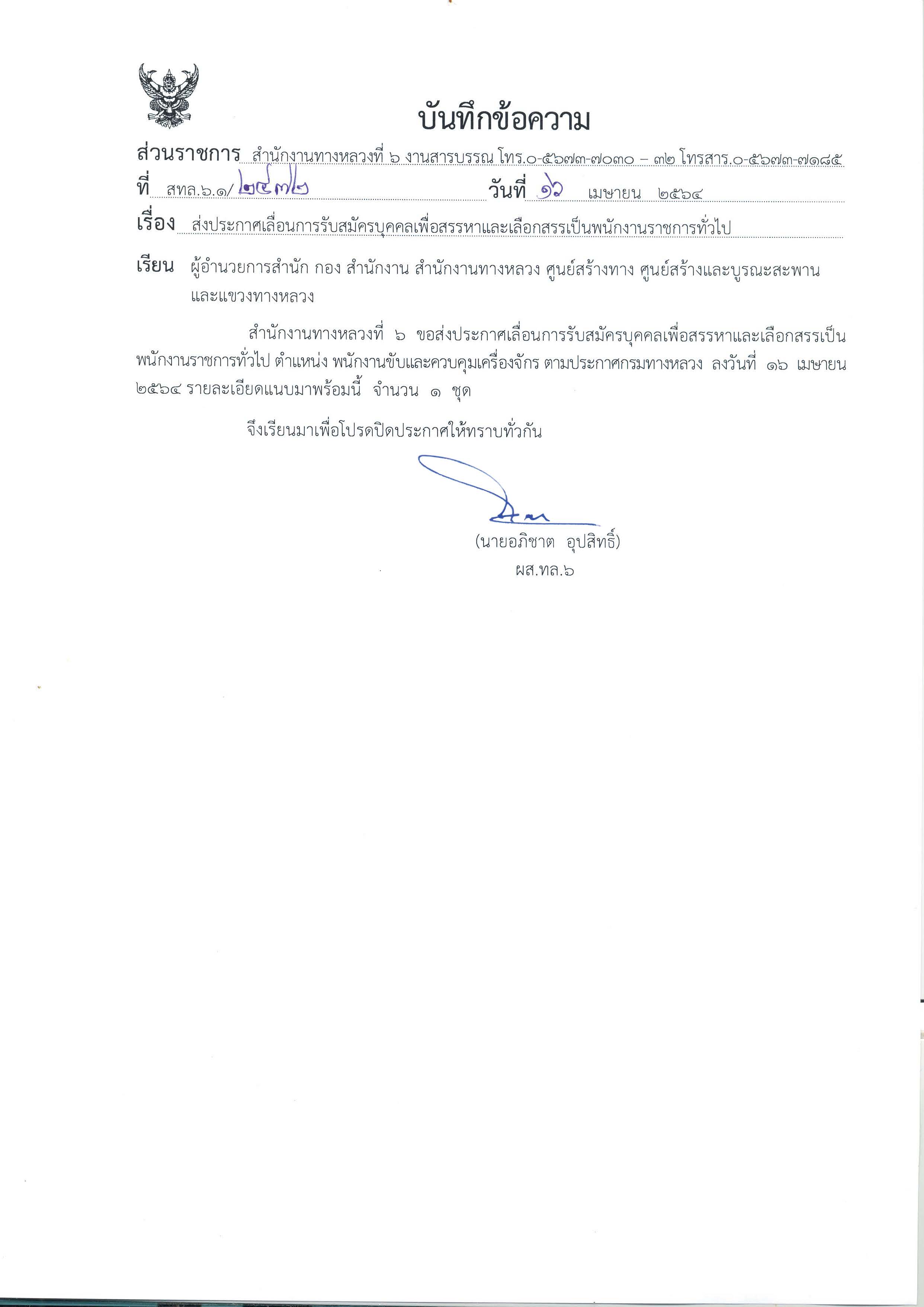 สำนักงานทางหลวงที่ 6 (เพชรบูรณ์) ประกาศเลื่อนการรับสมัครบุคคลเพื่อสรรหาและเลือกสรรเป็นพนักงานราชการทั่วไป ตำแหน่ง พนักงานขับและควบคุมเครื่องจักร