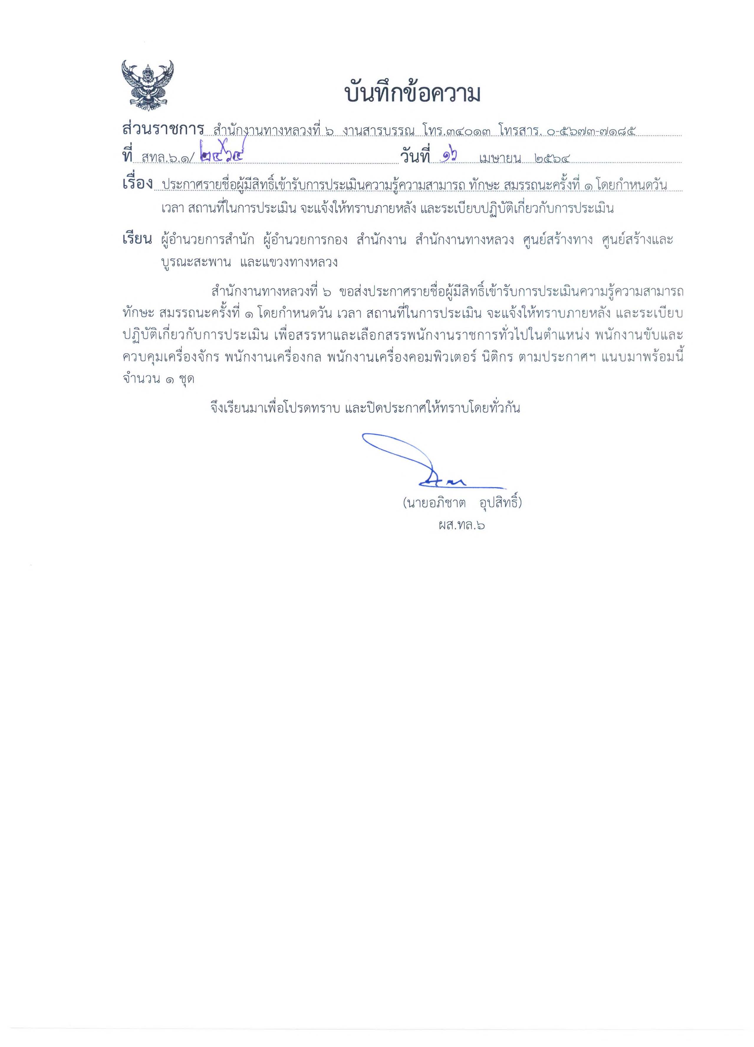 ประกาศรายชื่อผู้มีสิทธิเข้ารับการประเมินสมรรถนะครั้งที่ 1 ตำแหน่งพนักงานขับและควบคุมเครื่องจักร, ตำแหน่งเครื่องกล, ตำแหน่งพนักงานคอมพิวเตอร์ และตำแหน่งนิติกร