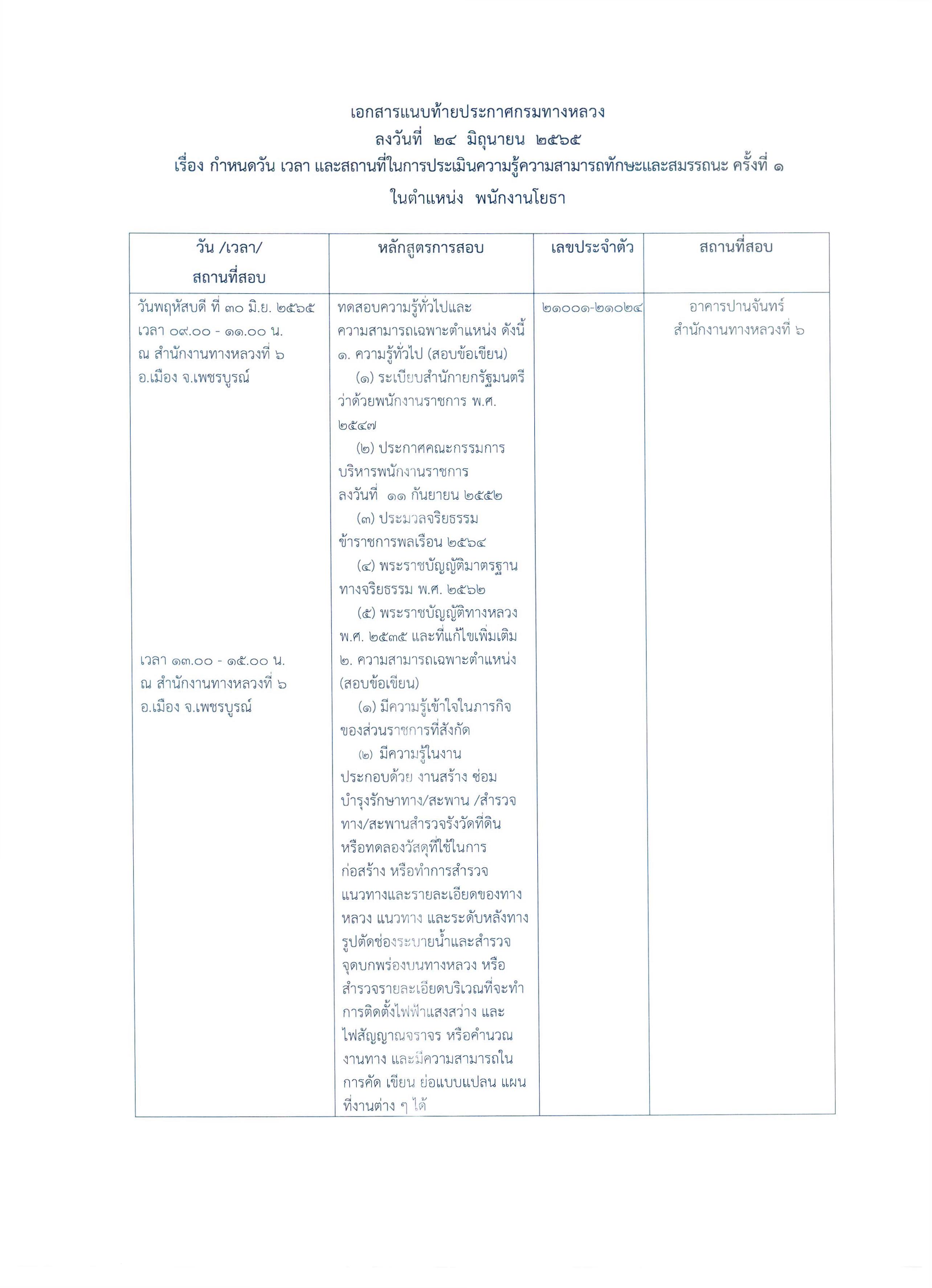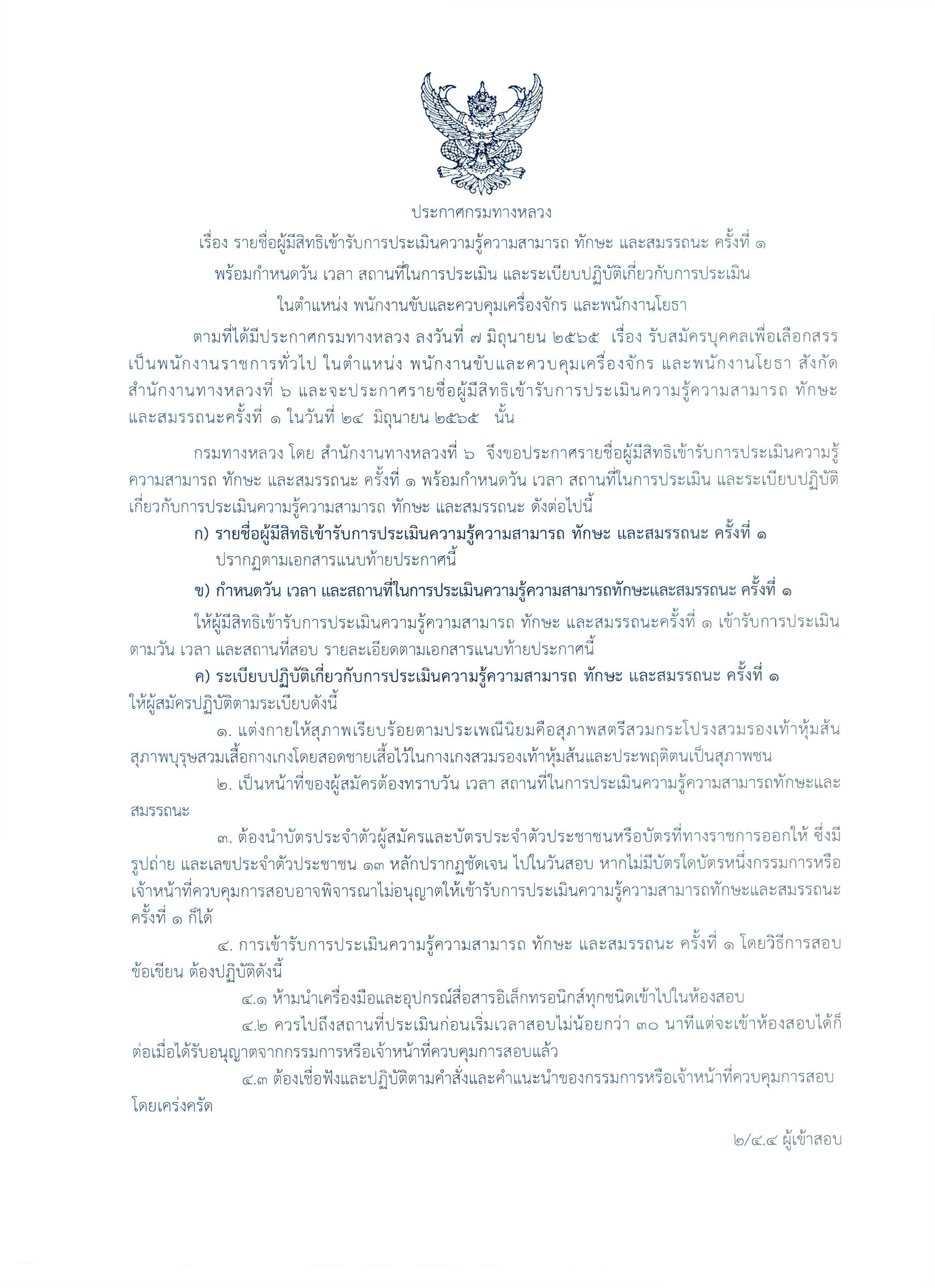 สำนักงานทางหลวงที่ 6 (เพชรบูรณ์) ประกาศรายชื่อผู้มีสิทธิเข้ารับการประเมินสมรรถนะครั้งที่ 1 ตำแหน่งพนักงานขับและควบคุมเครื่องจักร, พนักงานโยธา