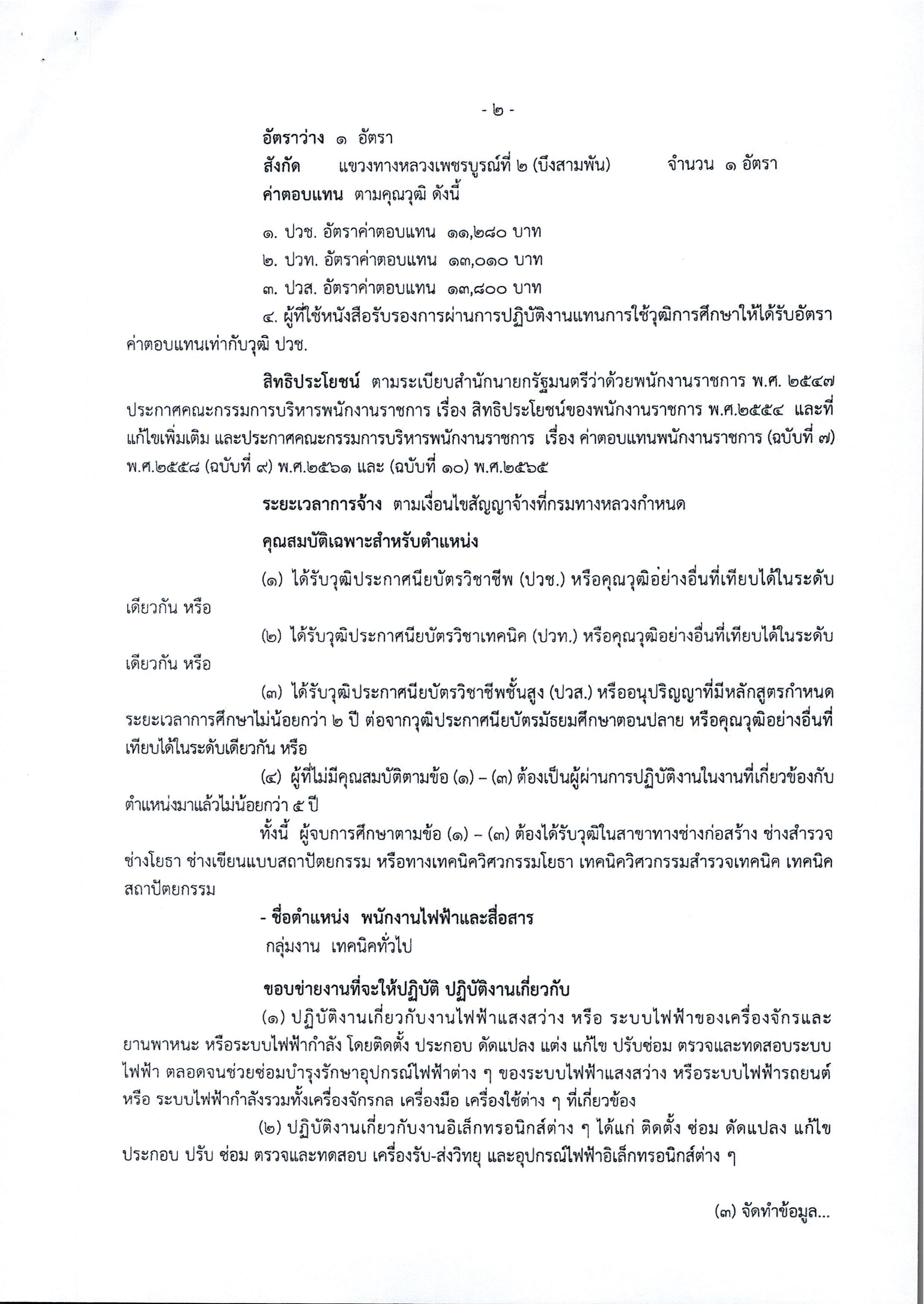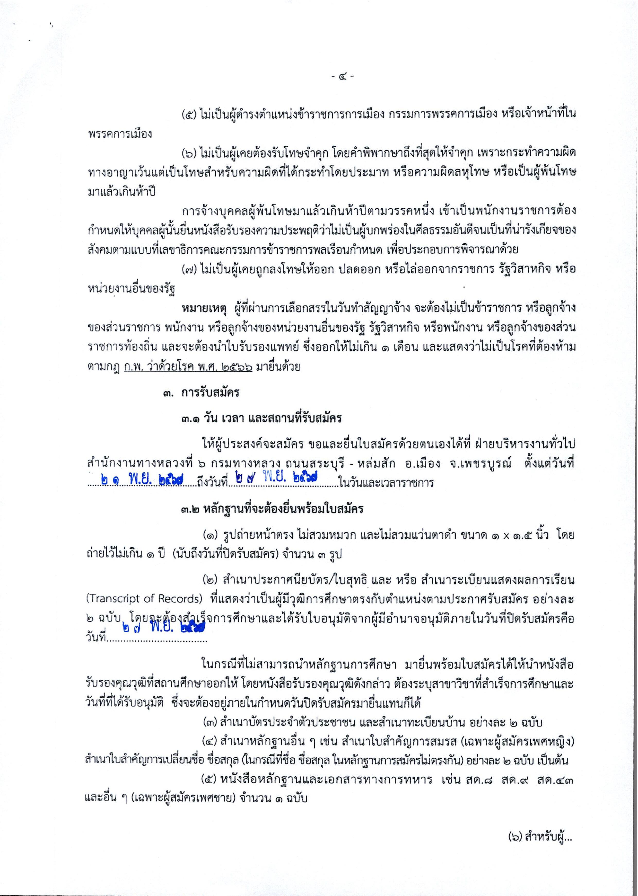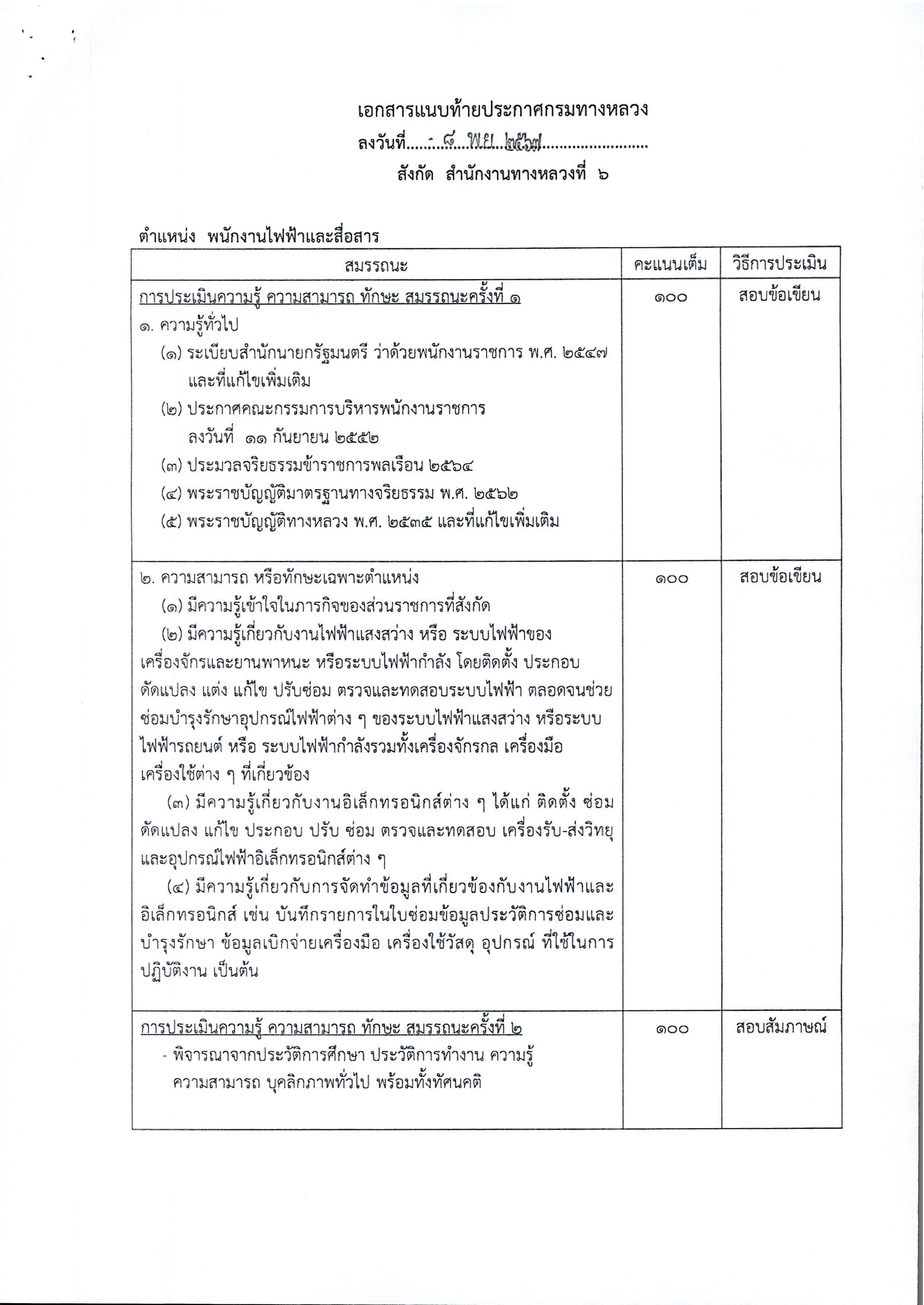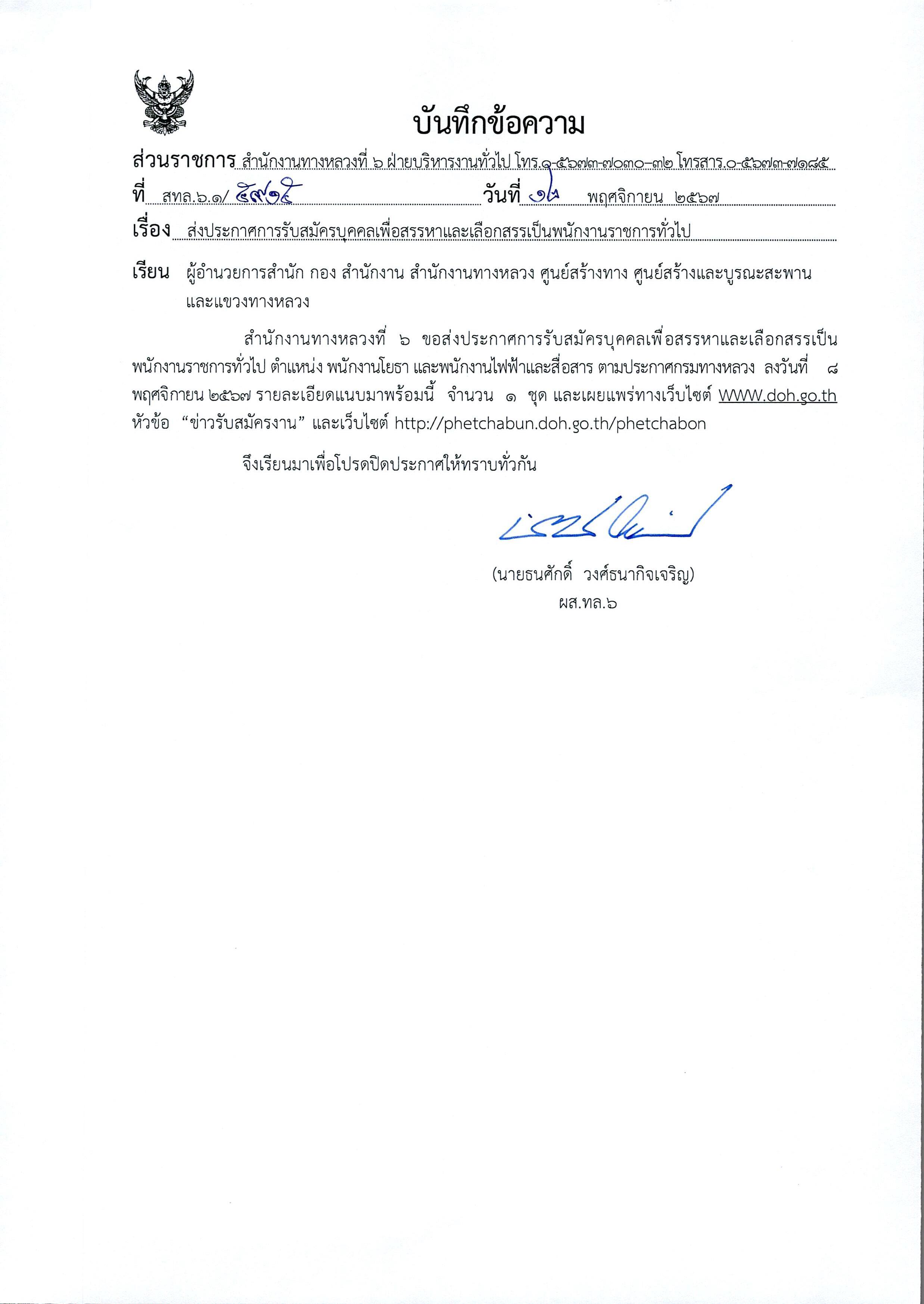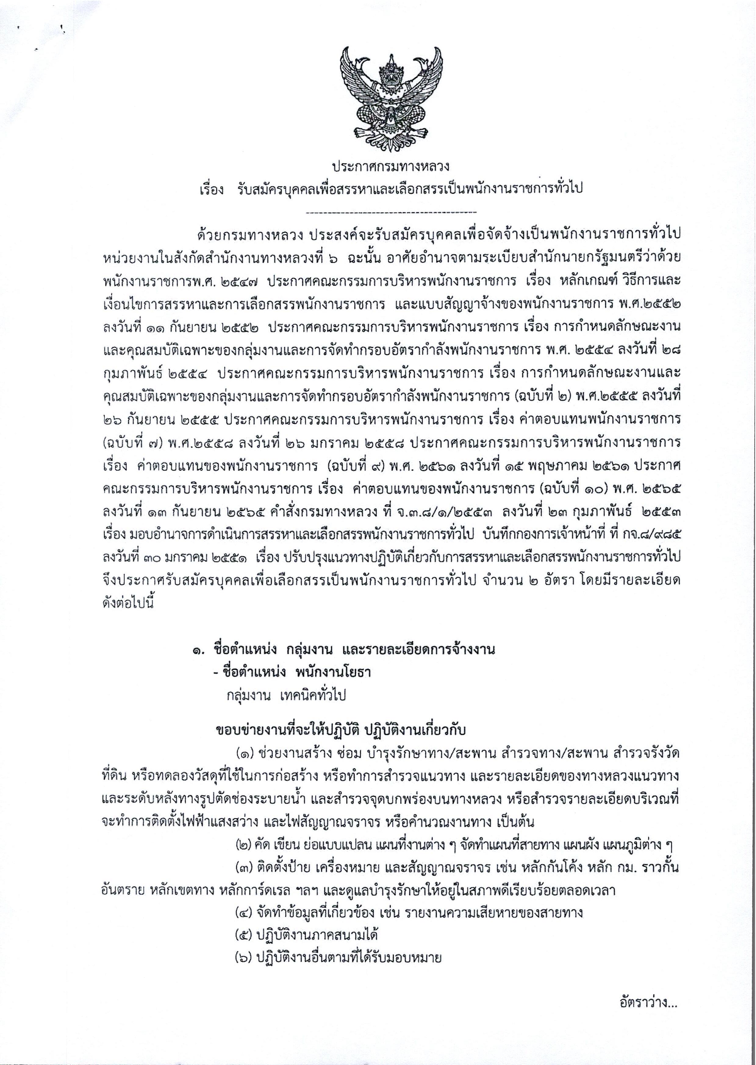 สำนักงานทางหลวงที่ 6 (เพชรบูรณ์) ประกาศรับสมัครบุคคลเพื่อสรรหาและเลือกสรรเป็นพนักงานราชการทั่วไป ตำแหน่งพนักงานโยธา และตำแหน่งพนักงานไฟฟ้าและสื่อสาร