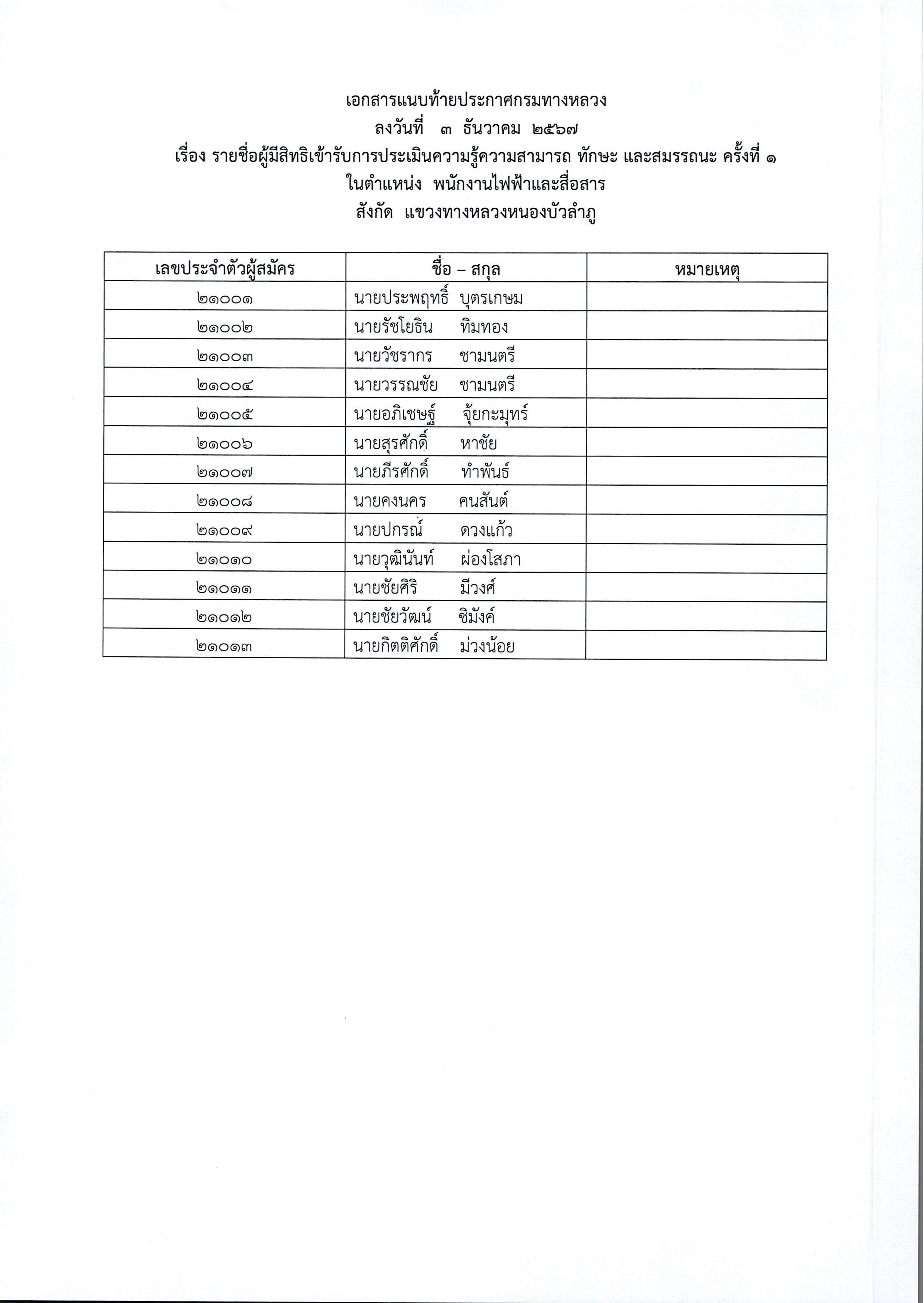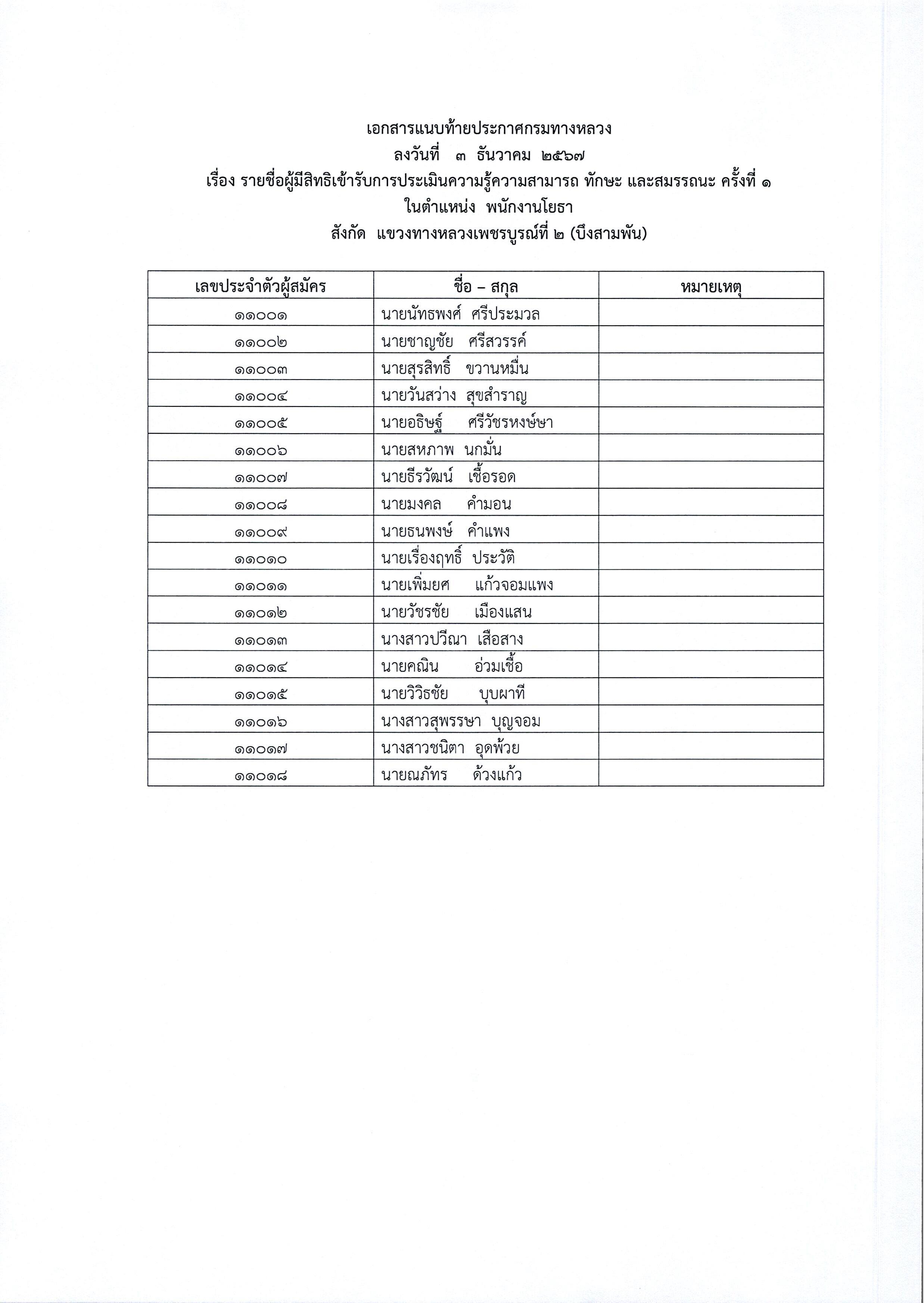 สำนักงานทางหลวงที่ 6 (เพชรบูรณ์) ประกาศรายชื่อผู้มีสิทธิเข้ารับการประเมินสมรรถนะครั้งที่ 1 ตำแหน่งพนักงานโยธา, ตำแหน่งพนักงานไฟฟ้าและสื่อสาร
