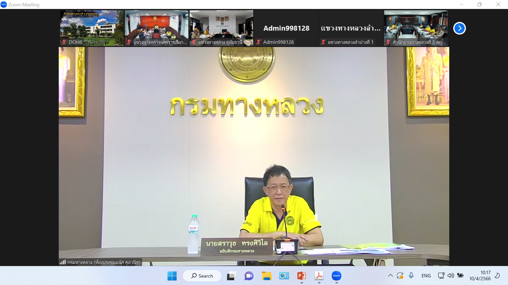 วันที่ 10 เมษายน 2566 เวลา 10.00 น. นายสราวุธ ทรงศิวิไล อธิบดีกรมทางหลวง เป็นประธานการประชุม เร่งรัดติดตามผลการดำเนินงาน และการเบิกจ่ายเงินงบประมาณ ประจำปี พ.ศ.2566 ผ่านการประชุมทางไกลด้วยระบบ Zoom Cloud Meeting จากห้องประชุมมนัส คอวนิช กรมทางหลวง มายังส่วนภูมิภาค โดยมี นายอภิชาต อุปสิทธิ์ ผู้อำนวยการสำนักงานทางหลวงที่ 6 พร้อมด้วย ข้าราชการในสังกัด เข้าร่วมประชุม ณ ห้องประชุมสำนักงานทางหลวงที่ 6 (เพชรบูรณ์)
